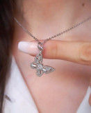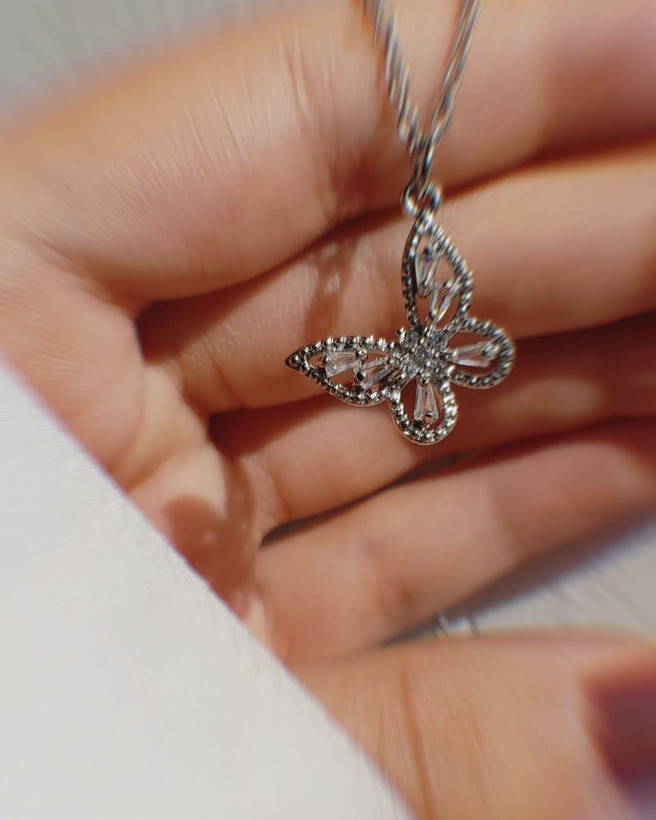 این گردنبند با طرح پروانهای و نگینهای درخشان، جلوهای ظریف و شیک دارد. طراحی پروانه نمادی از تحول، زیبایی و آزادی است، که این مدل را به گزینهای خاص برای استایلهای روزمره و رسمی تبدیل میکند.